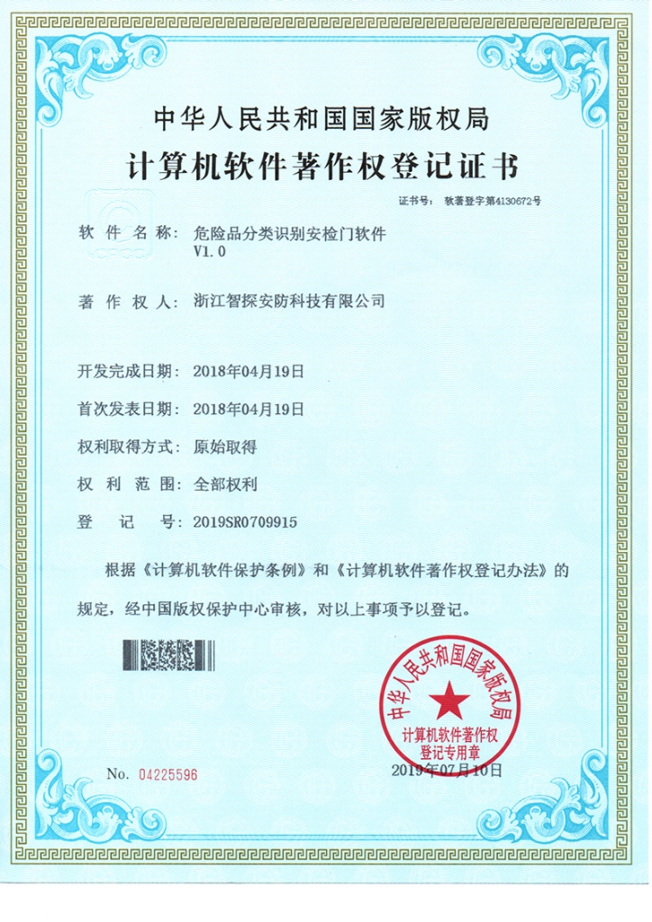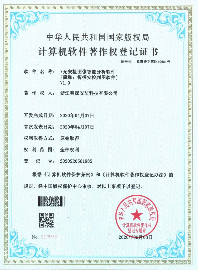 • 違禁品智能識別安檢儀專利證書