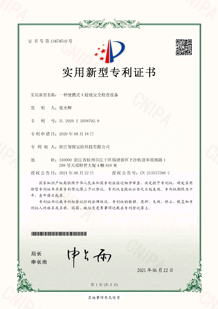 • 便攜式X射線檢查設(shè)備專利證書